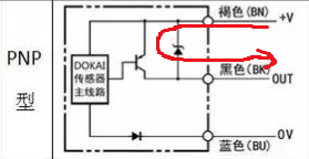 当光电开关有动作信号时,如果红色线条所示,0V从OUT线输出。