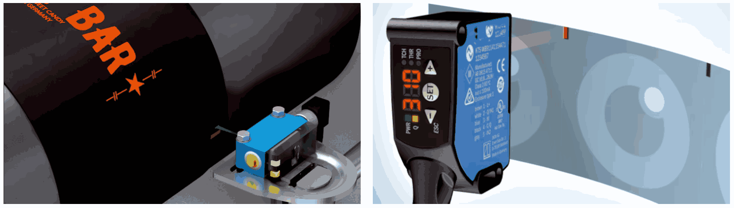 色标传感器主要用在包装 / 印刷机器,用来识别标签。 色标传感器高速计算较小的对比度,比如在薄膜或者包装上的印刷标签。